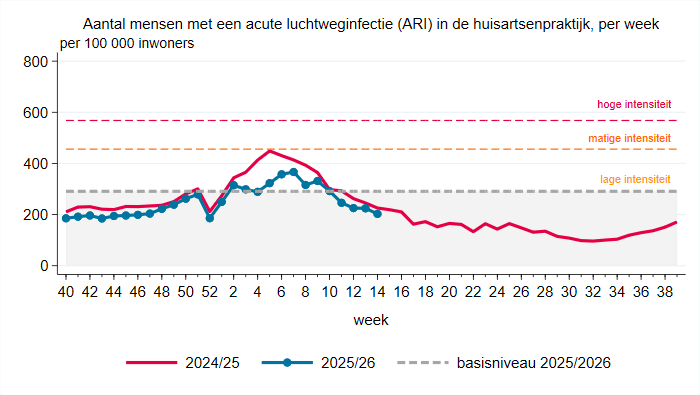 - Het aantal mensen dat bij de huisarts komt met een acute luchtweginfectie(ARI) is in week 14 op basisniveau en gebruikelijk voor de tijd van het jaar.