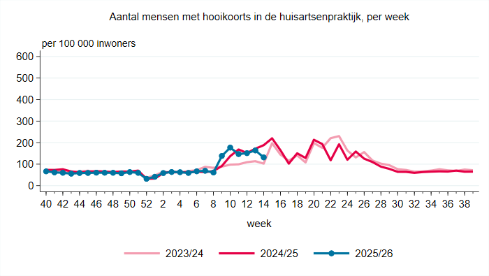 - In week 14 (30 maart – 5 april) is het aantal mensen dat vanwege hooikoorts bij de huisarts komt afgenomen in vergelijking met de 4 weken ervoor.