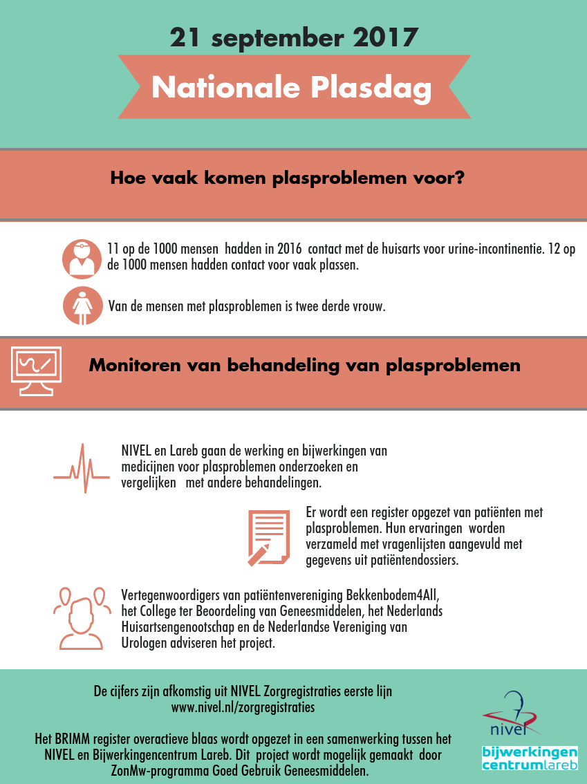 Het NIVEL en Bijwerkingencentrum Lareb gaan de behandeling voor plasklachten monitoren. In 2016 hadden 11 op de 1000 mensen contact met de huisarts voor urine-incontinentie. En 12 op de 1000 mensen hadden contact in verband met vaak plassen. 21 september is het nationale plasdag. Deze dag wordt georganiseerd door de Continentie Stichting Nederland om plasklachten beter bespreekbaar te maken.
