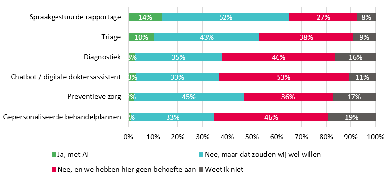 Nog maar een klein deel van de huisartsenpraktijken zet AI-ondersteunde digitale zorgtoepassingen in: AI-ondersteunde spraakgestuurde rapportage (14%) en AI-ondersteunde triage (10%) werden het vaakst aangevinkt. Verschillen in de inzet hiervan naar praktijkvorm, stedelijkheid en praktijkomvang zijn doorgaans klein. Ongeveer de helft van de praktijken geeft aan behoefte te hebben aan AI-ondersteunde spraakgestuurde rapportage, preventieve zorg of triage. Daar staat tegenover dat bijna de helft van de praktijken aangeeft géén behoefte te hebben aan AI-ondersteunde chatbots of digitale doktersassistenten, diagnostiek of gepersonaliseerde behandelplannen.