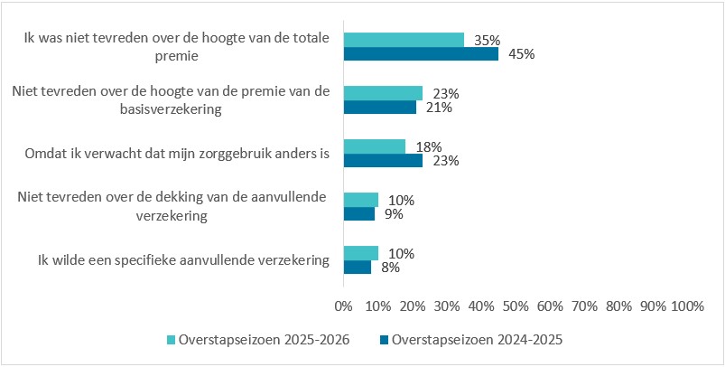 Van de verzekerden gaf 11% aan gewisseld te zijn van zorgverzekeraar in het overstapseizoen 2025-2026. Ontevredenheid over de hoogte van de totale premie was opnieuw de meest genoemde reden om over te stappen (35%), wat een lager percentage is dan in het vorige overstapseizoen (45%). Ook de hoogte van de premie van de basisverzekering (23%) en het verwachte zorggebruik (18%) zijn redenen om over te stappen. Dit jaar koos 8% de reden ‘Mijn gezinssituatie is veranderd’. In vorige jaren was dit 0-5%.